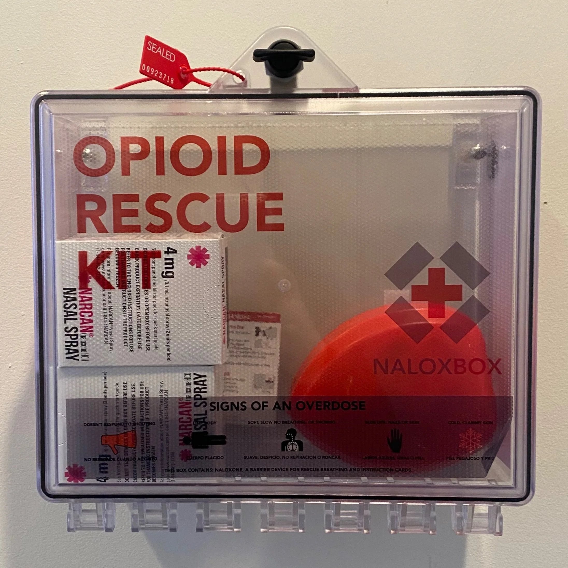 To increase the availability of naloxone in public spaces, the housing form ideally lives on the wall in a centralized location.